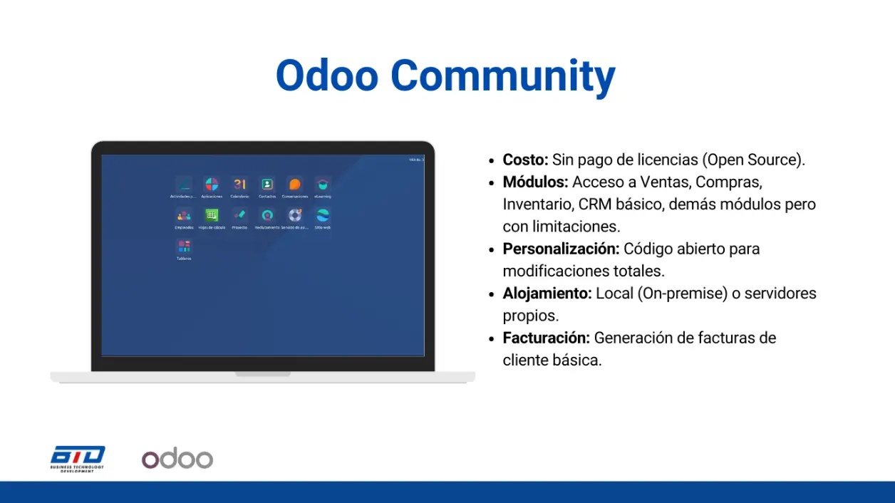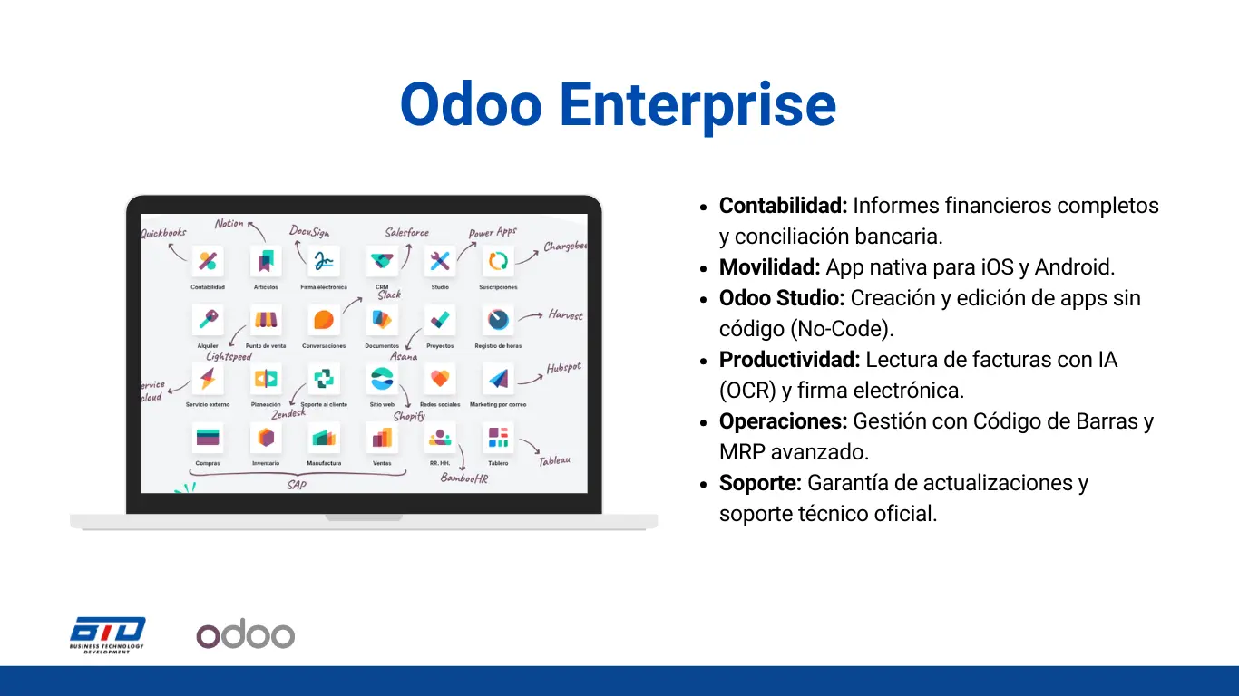 Odoo es la solución definitiva para empresas que exigen modernidad y eficiencia. Gracias a su estructura modular, usted puede integrar ventas, CRM, inventarios y contabilidad a su propio ritmo. Su interfaz intuitiva garantiza que su equipo alcance la máxima productividad desde el primer día